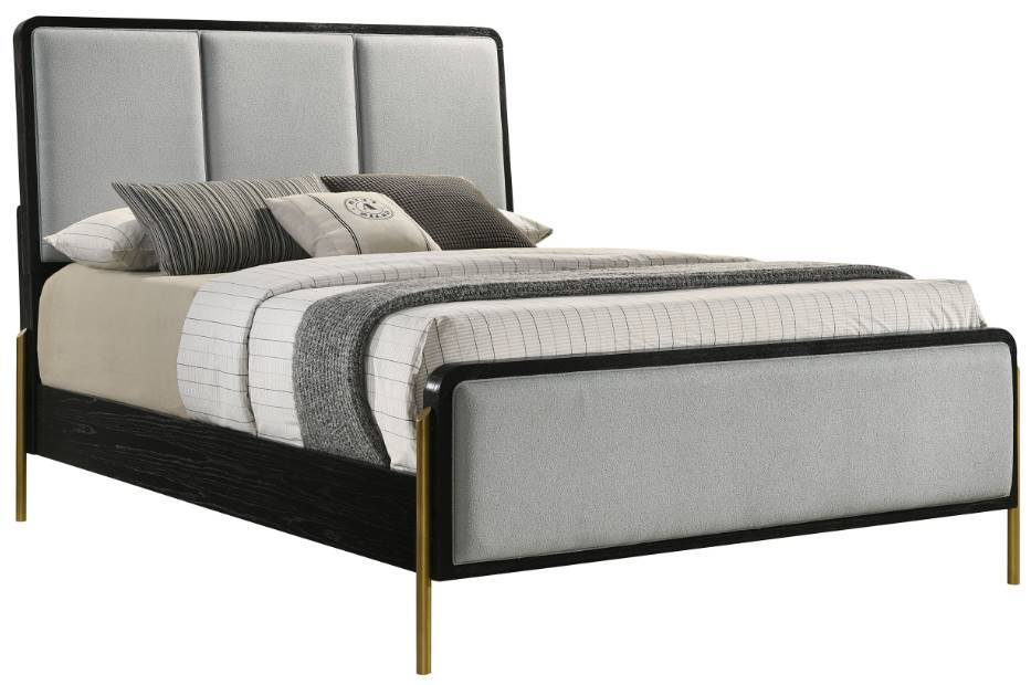 Head and footboards feature soft gray upholstery that infuses on-trend sophistication