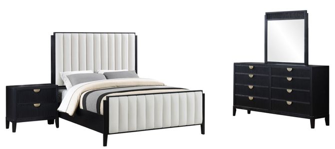 Upgrade your bedroom with the fresh, refined style of a four-piece modern bedroom set. In black, the set features ivory upholstery with vertical channel tufting on bed, creating a chic focal point. The nightstand and dresser are each adorned with fluted details and gold finish demi-lune pulls that add sophistication.Read More