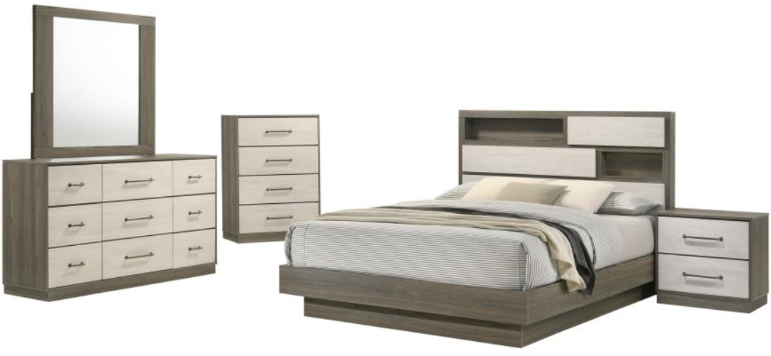 Includes: One (1) eastern king bed, one (1) nightstand, one (1) dresser, one (1) dresser mirror, and one (1) chest