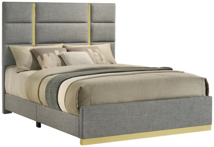 Modern elegance meets clean geometry in this upholstered panel bed, inspired by contemporary italian aesthetics. A tall headboard is accented with vertical gold acrylic strips that create striking visual contrast and refined symmetry.Read More