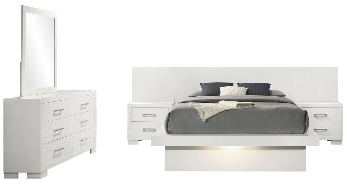 Architectural balance defines this bedroom set, complete with headboard extension panels that gracefully frame coordinating nightstands for a cohesive composition. Integrated LED lighting beneath the bed’s platform rail casts a gentle glow, enhancing its floating presence. Complementary storage pieces feature felt-lined drawers and sleek bar hardware, blending form and function seamlessly.Read More