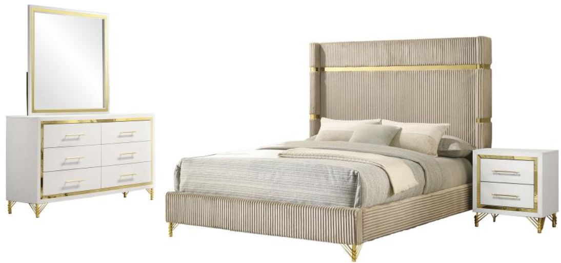 Effortlessly blending inviting softness and timeless sophistication, this four-piece modern bedroom set creates a rich but inviting ambiance. It centers on a stylish upholstered bed that pairs beige upholstery with a fluted look, creating impressive texture and dimensionality.Read More