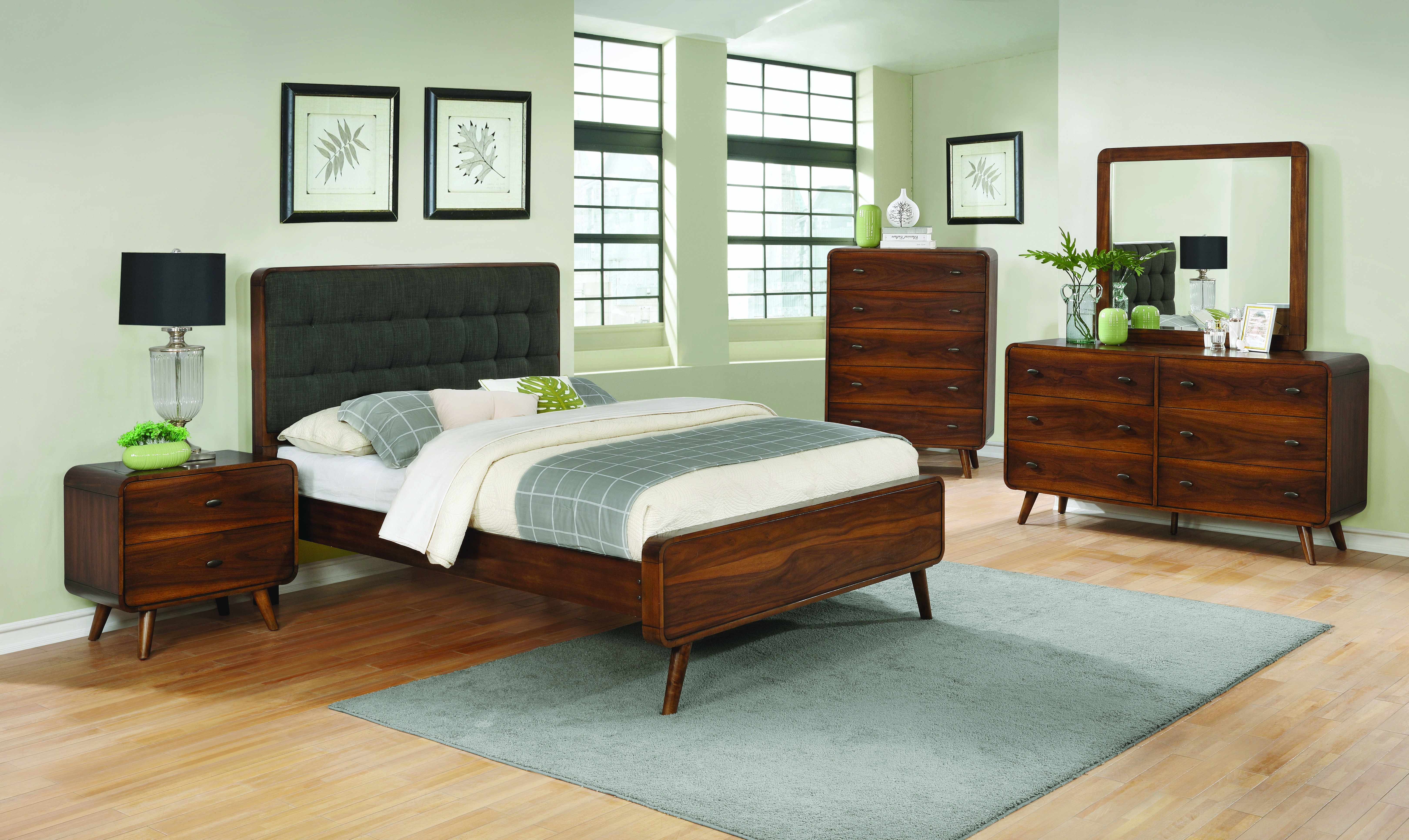Full of chic sophistication, the Robyn collection turns your bedroom into a groovy retreat. The dark walnut finish, rounded edges, angled legs, and wood-grain accents add refined countryside vibes and mid-century style into your space. For a sleek, throwback feel in your dream oasis, look no further than this CoasterEssence collection.